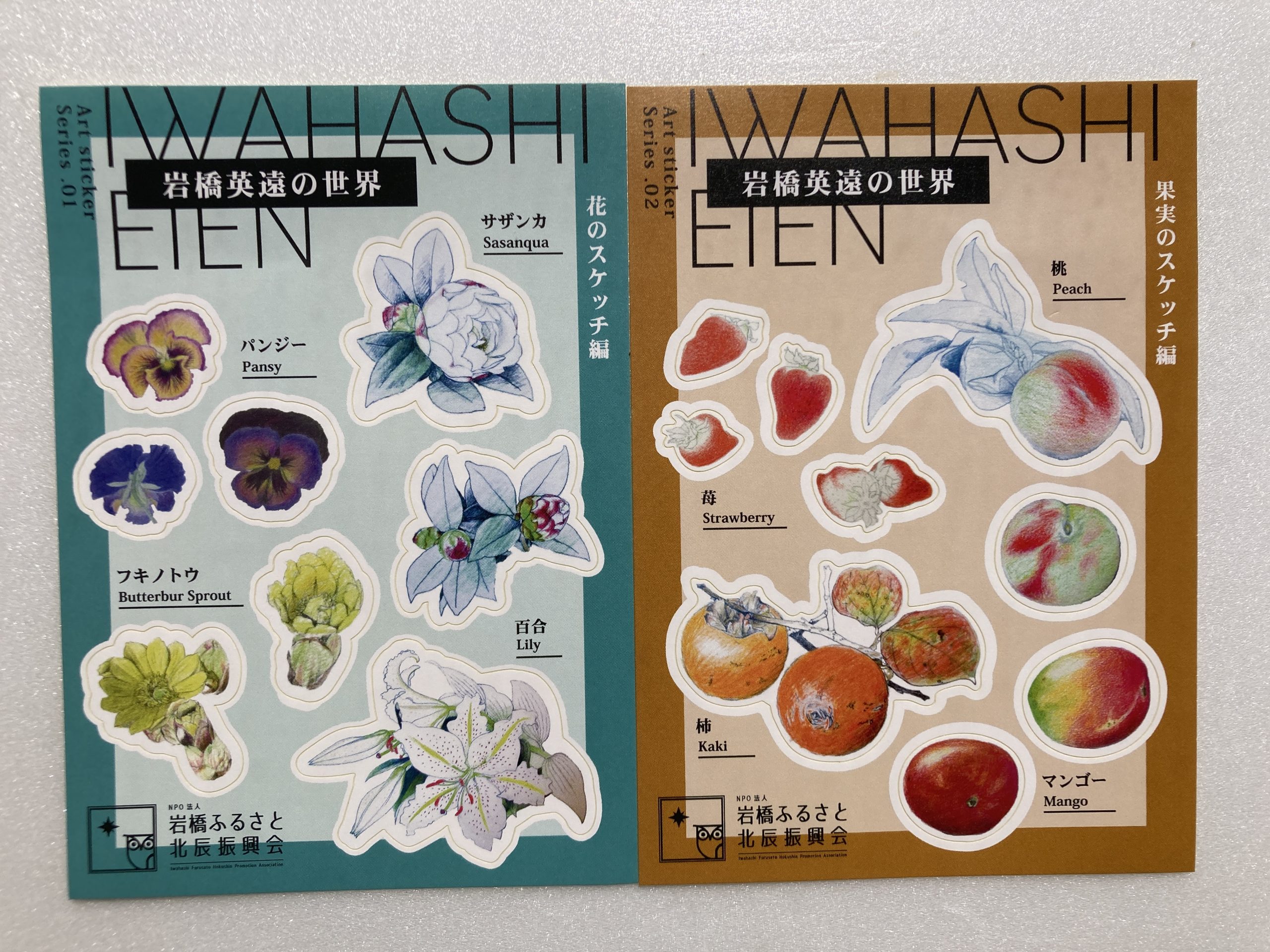 それらの中から、今年度は色鉛筆などで美しく彩色された花と果実、2種類のシールを作成しました。岩橋英遠を、より身近に感じてもらえるようにと、桜の森カフェ(5月6日)や江部乙小学校の6年生たちとの植樹祭(5月13日)等のイベントでノベルティとして活用しています。