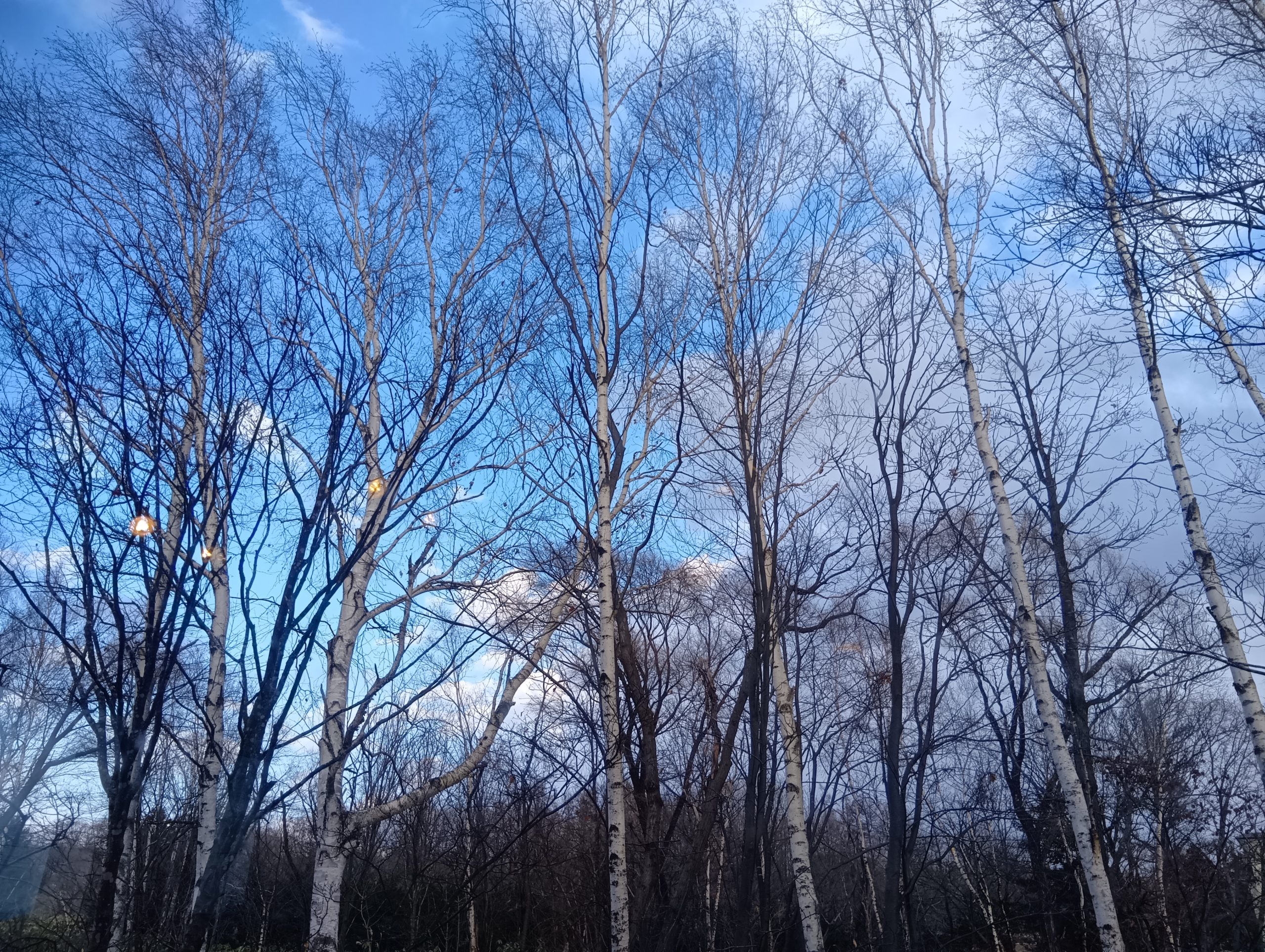 江部乙のカフェ・オルノの窓から眺めた東側の庭の白樺林です。午後になって冷たい雨がやっと上がり、青空が少しだけ顔を見せてくれました。夏には葉を茂らせ、涼しい木陰を作ってくれていた木々も、今はすっかり葉を落とし、空がよく見えるようになっています。カフェでは柿と生ハムのピザ、スパゲッティカプレーゼ、栗の入ったロールケーキとコーヒー、季節の美味しいものをのんびりといただいてきました。12月に入ると毎日雪が降り続き、もう春まで解けない根雪になると天気予報が伝えています。今年最後の、江部乙の雪のない風景を楽しんだ、のどかな日曜日の午後でした。