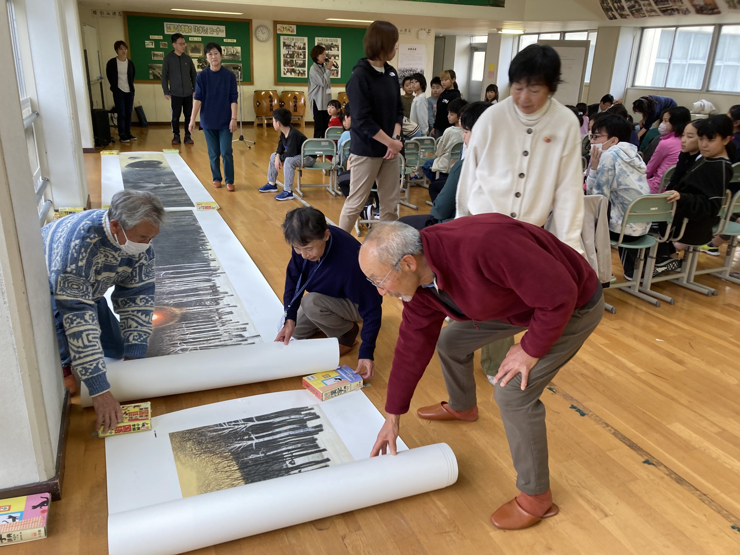当日は同小児童による「屯田太鼓」の演奏で始まり、続いて桜サポーターの北川さん、河野さん、金子さんの3人が、全校児童44人にむけて岩橋英遠のこと、道産馬と道産子のこと、新しく展示された複製画の《道産子追憶之巻》のことなどについて説明しました。その後、寄贈したものとは別の、原寸大の《道産子追憶巻》の高精細複製画(30メートル近くあります)をプレイルームの床に広げて、絵の中に隠れているたくさんの動物たちを探すゲームを楽しみました。子どもたちは「フクロウがいた」「ネズミかな、リスかな?」「熊が寝てる!」「鹿、発見」などと歓声を上げながら、熱心に絵巻に見入っていました。
