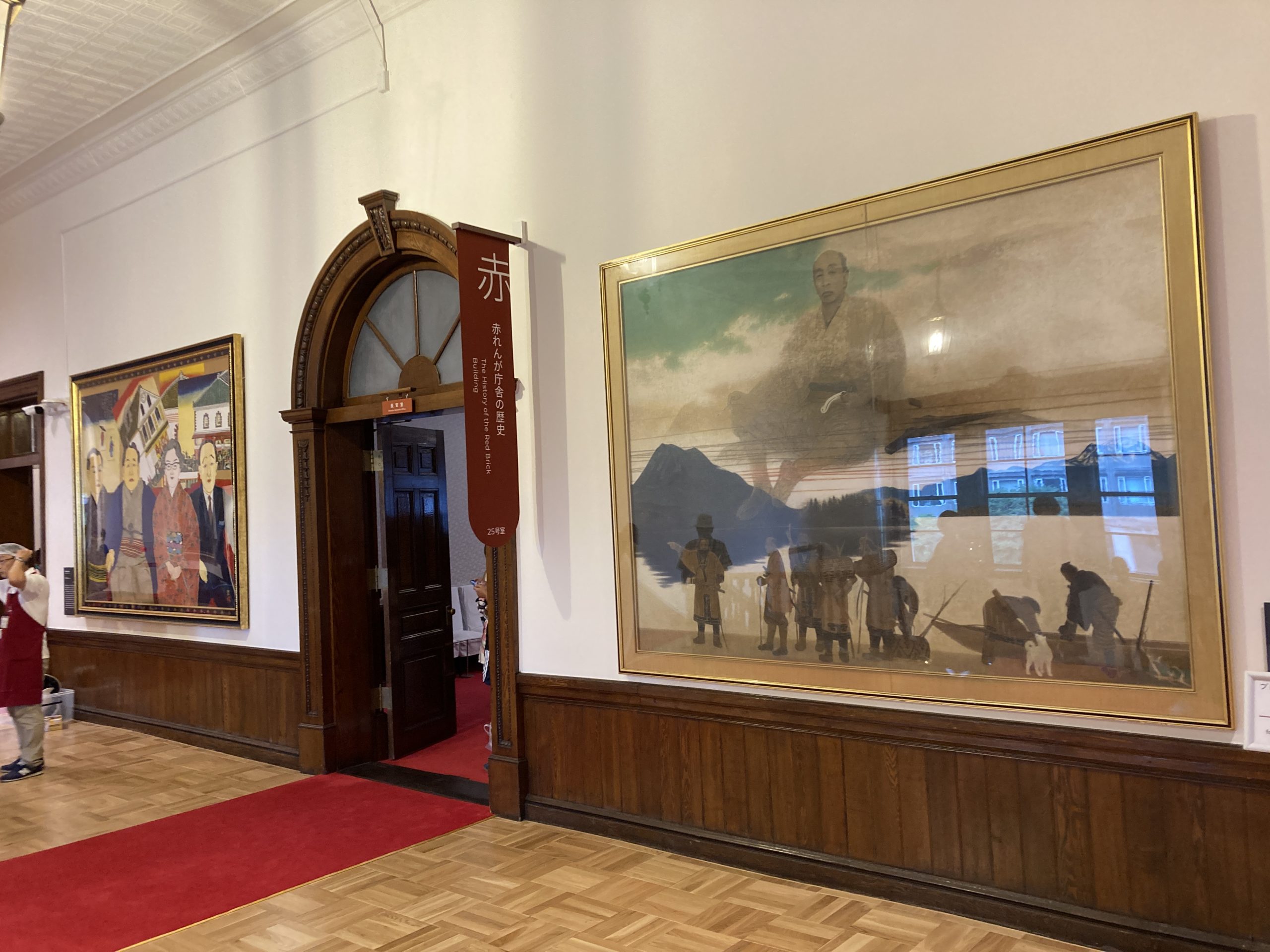 7月25日、北海道庁旧本庁舎(赤れんが庁舎)の大規模改修工事が終わり5年振りに再開館されました。この建物は1888(明治21)年に北海道庁本庁舎として竣工、以来137年の歴史ある建物で、国指定の重要文化財となっています。1968(昭和43)年に大規模な復元が行われ、翌1969年に赤れんが庁舎が国の重要文化財に指定されたことを記念し、道庁では北海道開拓使にまつわる絵画を展示することを計画します。北海道ゆかりの画家20人に道が制作を依頼、岩橋英遠には北海道の名付け親とも言われる松浦武四郎についての作品の制作依頼がありました。英遠の作品《阿寒湖畔の松浦武四郎》は、その後長く2階記念室前に掲示されていましたが、今回の大改修に伴い他の作品と共に一時見ることができなくなっていました。それが今回、5年振りに再び展示されました。同作品は2階への中央階段を上がった正面右側の、これまでと同じ位置に展示され、その左側にはこれまで別の場所にあった片岡球子の《函館街頭風景》が展示されています。更に、《阿寒湖畔の松浦武四郎》と同じ側には、英遠の子ども時代からの友人である滝川出身の洋画家・一木万寿三作の《札樽間道路の開削》も展示されています。カフェや土産物コーナーも充実した新しい赤れんが庁舎で英遠作品とのひと時を過ごしてみてはいかがでしょうか。